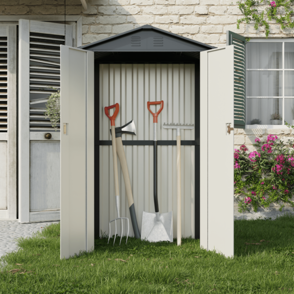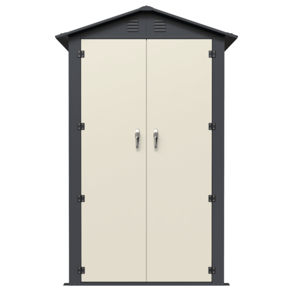 מחסן איכותי הכולל זוג דלתות מחוזקות, ידיות עם הכנה למנעול ופתחי אוורור